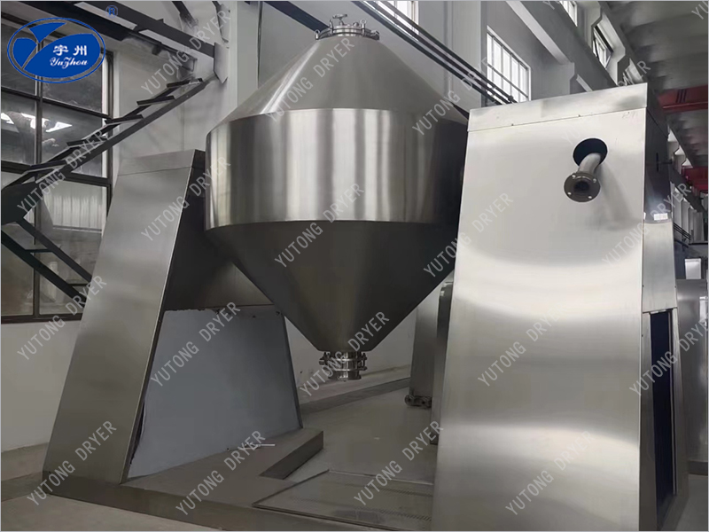 SZG series double-cone rotary vacuum dryer is a double-cone rotary tank body. The tank body is heated by heat conduction oil or hot water into the jacket under vacuum condition, and the heat is in contact with the wet material through the inner wall of the tank. The vapor or other gases that evaporate after absorbing heat from the wet material are pumped away through the vacuum pump through the vacuum exhaust pipe. Because the tank is in a vacuum state, and the rotation of the tank makes the material constantly up and down, inside and outside, it speeds up the drying speed of the material, improves the drying rate, and achieves the purpose of uniform drying.