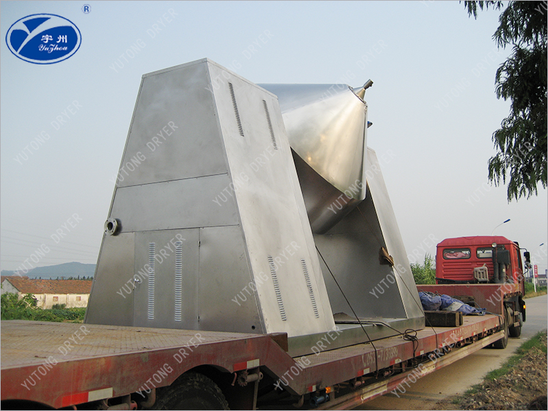 SZG系列雙錐回轉(zhuǎn)真空干燥機(jī)為雙錐形的回轉(zhuǎn)罐體,罐內(nèi)在真空狀態(tài)下,向夾套內(nèi)通入蒸汽或熱水進(jìn)行加熱,熱量通過(guò)罐體內(nèi)壁與濕物料接觸。濕物料吸熱后蒸發(fā)的水汽,通過(guò)真空泵經(jīng)真空排氣管被抽走。由于罐體內(nèi)處于真空狀態(tài),且罐體的回轉(zhuǎn)使物料不斷的上下,內(nèi)外翻動(dòng),故加快了物料的干燥速度,提高干燥效率,達(dá)到均勻干燥的目的。