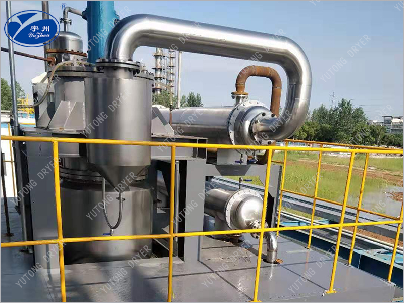 物料從加熱區(qū)的上方徑向進(jìn)入蒸發(fā)器,經(jīng)布料器分布到蒸發(fā)器加熱壁面,然后旋轉(zhuǎn)的刮膜器將物料連續(xù)均勻地加熱面上刮成厚薄均勻的液膜,并以螺旋狀向下推進(jìn)。在此過程中,旋轉(zhuǎn)的刮膜器保證連續(xù)和均勻的液膜產(chǎn)生高速湍流,并阻止液膜在加熱面結(jié)焦、結(jié)垢,從而提高傳總系數(shù)。輕組份被蒸發(fā)形成蒸汽流上升,經(jīng)汽液分離器到達(dá)和蒸發(fā)器直接相連的外置冷凝器,重組份從蒸發(fā)器底部的錐體排出。 一個(gè)獨(dú)特的布料器不僅僅具有將物料均勻地流向蒸發(fā)器內(nèi)壁,防止物料濺到蒸發(fā)器內(nèi)部噴入蒸汽流,還具有防止剛進(jìn)入的物料在此處閃蒸,有利于泡沫的消除,物料只能沿著加熱面蒸發(fā)。在刮膜蒸發(fā)器的上部配有一個(gè)依據(jù)物料特性設(shè)計(jì)的離心式分離器,將上升蒸汽流中的液滴分離出來并返回布料器。