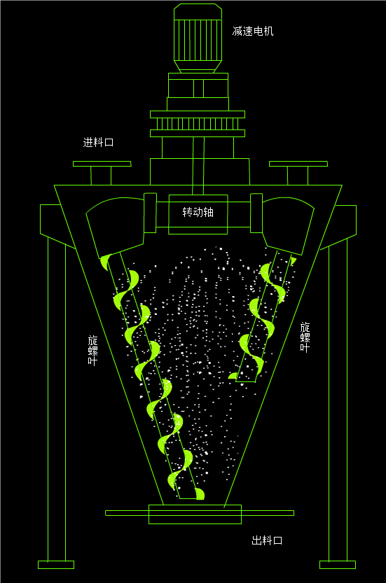1. 螺旋沿壁公轉(zhuǎn),使物料沿錐壁作圓周運(yùn)動(dòng);