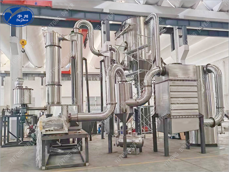 系統(tǒng)在使用前,使用氮氣將系統(tǒng)內(nèi)的空氣置換出,使系統(tǒng)內(nèi)的氧氣含量達到溶媒的安全濃度之內(nèi)。循環(huán)氮氣經(jīng)加熱設(shè)備被加熱后進入閃蒸干燥機。濕物料由輸送裝置進入閃蒸干燥機的螺旋加料機構(gòu),螺旋加料器可變頻調(diào)速。物料經(jīng)螺旋輸送進入干燥破碎室,隨即被高速旋轉(zhuǎn)而又具有不同角度的刀片破碎,又被高速進入旋流干燥室的高溫氣流沖擊高速旋轉(zhuǎn)、夾帶上升,這時氣流溫度急速下降,物料中水分迅速蒸發(fā)從而完成干燥過程。過大物料被淘析環(huán)擋住落到干燥破碎室繼續(xù)破碎直到獲得細粉料。