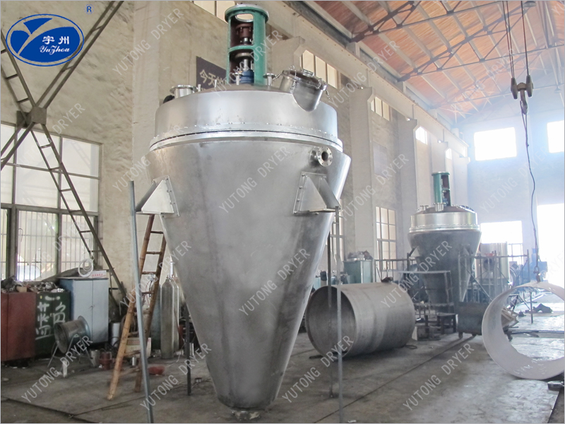 Основная часть устройства находится в вертикальном состоянии, а спиральная полоса с внутренним подогревом циркулирует и перемешивается, чтобы поднять движение. После того, как материал поступает в сушильную камеру, он нагревается оболочкой и перемешиваемой спиральной лентой, последовательно перемешивается спиралью, переворачивается, поднимается и опускается, так что материал постоянно контактирует со стенкой нагревательной камеры для принудительного теплообмена. Растворитель, испаряющийся при нагревании, извлекается в вакууме для достижения цели быстрой сушки.