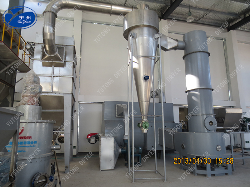 Окружающий воздух, прошедший начальную и промежуточную фильтрацию, продувается воздуходувкой сухой системы в паровой радиатор и нагревается до температуры, установленной в процессе. Затем он входит в сушильный концентратор с флэш - испарением и вместе с сухим фильтром, который подается в сухой хост через спиральный питатель, завершает процесс сушки теплоносителя в сухом хосте. Газоустойчивая смесь фильтруется мешковым пылеуловителем, а материал отделяется от газа в системе сушки и сбрасывается в систему сушки. Выхлопные газы выбрасываются в атмосферу из вентиляторов.