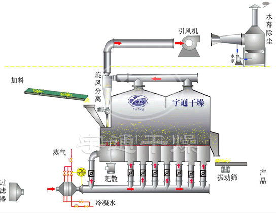 Чистый горячий воздух распределяется в кровать через клапанную пластину, а влажный материал, поступающий из питателя, кипит горячим воздухом. Из - за широкого контакта между горячим воздухом и материалом процесс теплопередачи усиливается, поэтому он может высыхать за относительно короткое время. При использовании непрерывного типа материал поступает с одного конца кровати, кипит и высыхает от нескольких секунд до нескольких минут, а затем автоматически вытекает с другого конца кровати. Устройство обычно работает под отрицательным давлением.